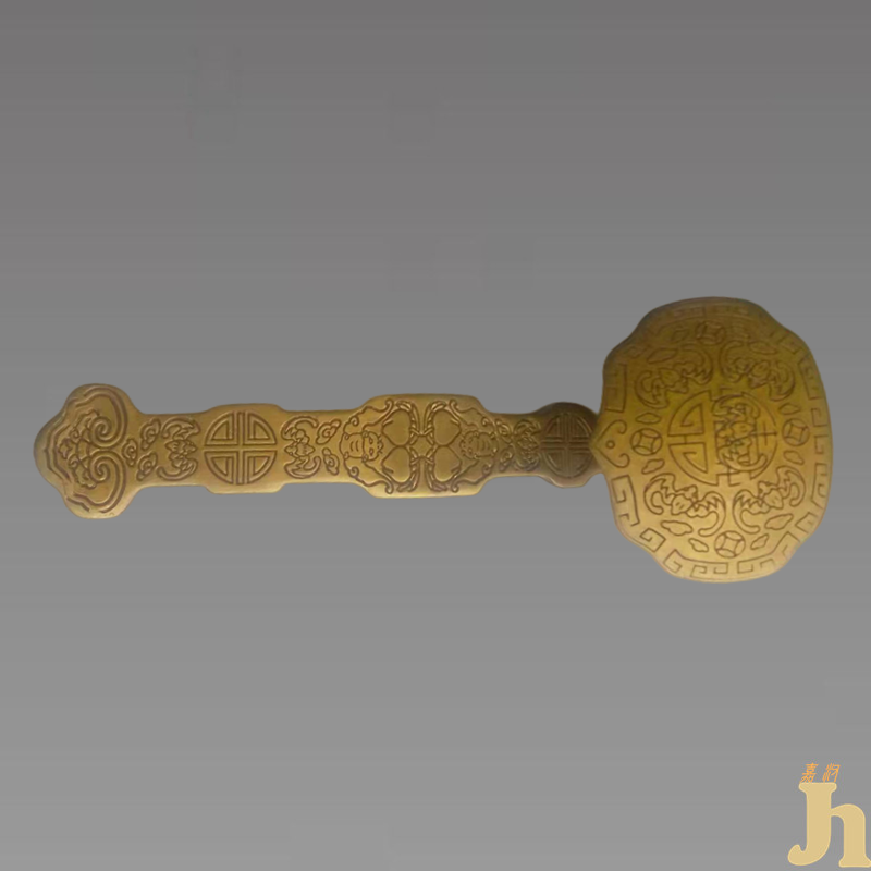 在清代宫廷中,如意更是备受推崇。皇帝登基、大婚,元旦、万寿等节庆之日,天下最精粹华美的如意纷纷被贡入皇宫。于是宫禁之内,宝座、卧榻、案头等角角落落都少不了如意的形影。这些如意取材上贵比金玉,制艺上穷极工巧,所以清宫中的如意已不仅是一种象征吉祥的工艺品,更是权位和财富的象征。此如意通体铜镀金錾蝠寿纹地。首尾圆形,并穹状隆起,此如意于金灿绚烂的富贵风格中又蕴含着古朴雅致之情趣。具有一定的收藏价值和文化艺术欣赏价值!