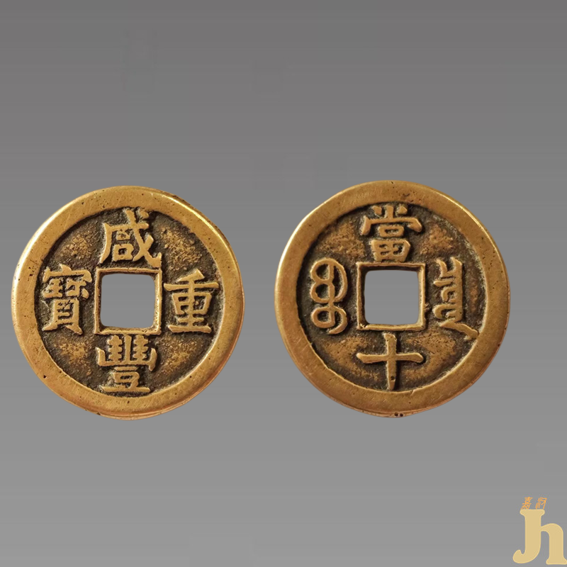 咸丰钱币虽然不是中国最早的铸币,但咸丰重宝当十至今仍被喻为钱币之首,它的铸期最长、数量最多、版式最丰富、流通度最广。黄铜质的原料,加上精良优美的外形,雕刻细腻的工笔,铜光闪闪的大字,古生古韵的包浆,就连细节处都是精雕细琢、几乎完美,实为艺术品市场中千年不遇的第一珍藏货币精品藏品。