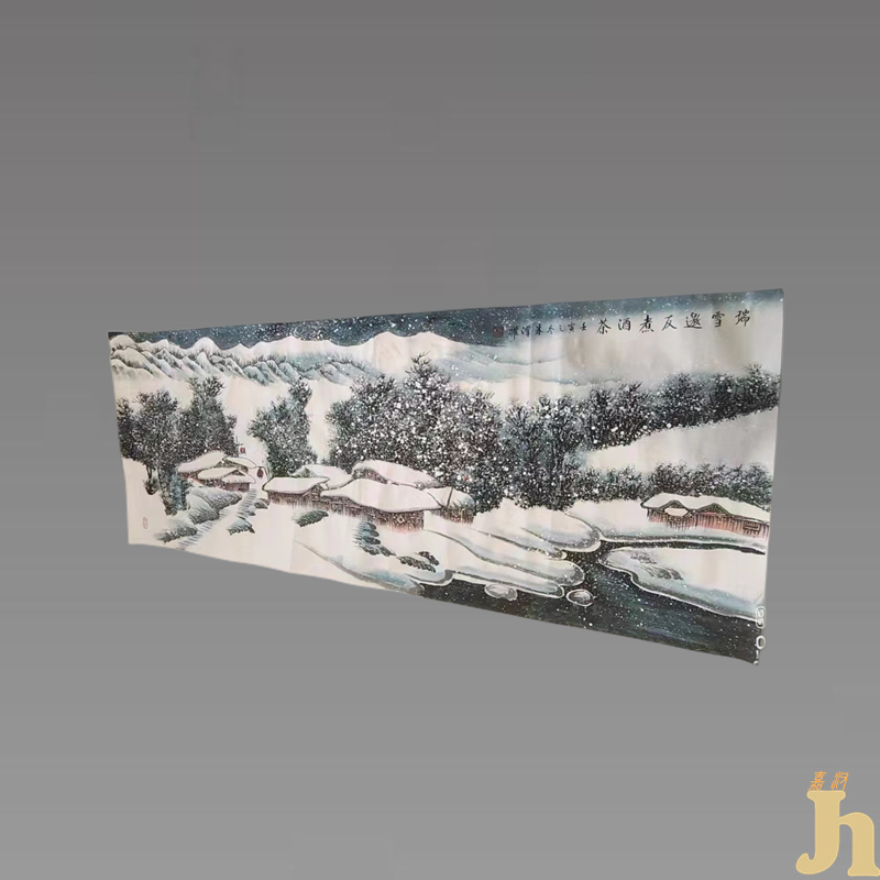 山水图采用由远景到近景的方式详细描绘了远处的朦胧感和近景的墨色浓淡反差形成立体感,整个画面浑然一体典雅高端,山水,大树,房屋被大雪覆盖等景色描绘,细致生动,仿佛身临其境!此作品画风精湛,雪景柔和,房屋耸立,绘画细致入微,动中带静,静中凸显立体,远看大好河山,近看幸福生活,似田园风光无限好,又不失高雅庄重,意境独特优美,具有一定的文化艺术欣赏价值和收藏价值!