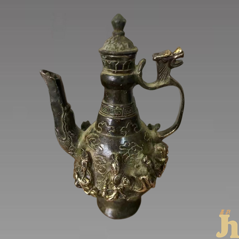 据资料记载此类风格的执壶是御用酒壶,也是至今为止一款皇帝使用的酒壶。八仙过海人物造型经铸造艺人手工打磨而成,艺术流畅,线条整体稳重大方,壶口是皇冠阳花纹饰,龙头威武,壶嘴凤凰纹饰秀美,壶口略平于壶嘴。底部繁体字大明宣德,大字人造型,明字强劲有力,宣字点不过横盖竖直到底,德字繁体古文,此为上品,令人爱不释手。