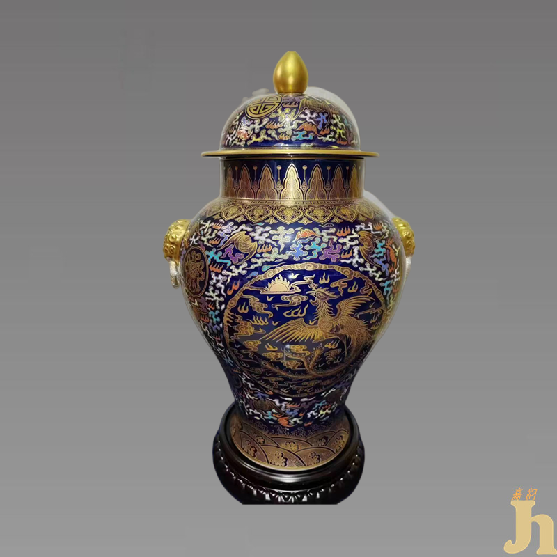 经典器型:黄金珐琅龙凤尊以中国传统器型将军罐为原型进行创作,将军罐,是中国陶瓷艺术的珍品,因罐盖形似将军盔帽而得名。将军罐的造型显得挺拔向上,气魄宏伟,非常庄严。
