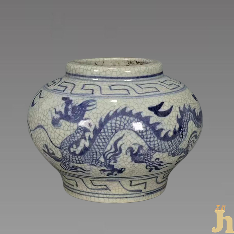 此罐直口,短颈,鼓腹,宽矮圈足。周身开片自然,外壁以青花装饰,底部为“大明宣德年制”六字青花楷书款,颈部绘青花圈和回纹,颈下绘青花双圈纹和整体龙纹,龙纹张口怒齿吐舌,奋爪腾飞,遒劲威武,一展叱诧风云之态。鼻吻向上外翻,下颚胡须向后飞扬,两鹿角压低贴近向后飞扬的数屡鬃鬓,神采奕奕,惟妙惟肖,鳞片描绘精细,片片单独晕染;所施青花料发色艳丽,浓淡相宜,深得水墨画神韵;笔法细致,极为流畅,画面生动传神,气势恢宏,壹派皇家之势。整体胎细色净,发色浓湛,釉润如脂。浓淡青花点染娇蕊,笔道劲捷有力,写意捕捉枝叶芳华之姿,亭亭玉立,跃然眼前,纹饰布局舒朗大方,细节精妙巧致,釉色洁白莹亮,与青花相互辉映,三爪龙纹因其结构连绵不断,寓有“生生不息”之意。寓意吉祥。具有一定的收藏价值和文化艺术欣赏价值!