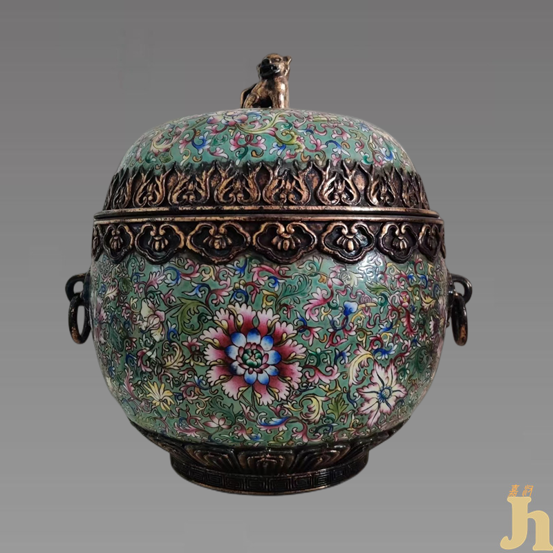 珐琅彩缠枝花卉纹盖罐,整件器物色彩鲜艳夺目,蓝彩浓重深沉,使得红黄彩反而不再明显,有厚重之感。整体绘缠枝花卉纹,栩栩如生。造型呈直口,短颈,溜肩,鼓腹,圈足,瑞兽钮盖。器物底部上的款识为“大清乾隆年制”表明此罐制作于乾隆年间,是清代宫廷的御用之物。景泰蓝是在铜胎上用柔软的铜丝,焊出各种图案花纹,然后在花纹内填满各种色釉,经过高温烧制,最后打磨镀金而成。 外观晶莹润泽,色彩鲜艳夺目。缠枝莲纹饰是缠枝纹的一种,为传统吉祥纹样。图案花枝缠转不断,故称缠枝纹,明代称为“转枝”。缀以花卉并点以叶子,便形成枝茎缠绕,花繁叶茂的缠枝花卉纹或缠枝花果纹。图案以莲花组成的称“缠枝莲”。缠枝纹又名“万寿藤”,寓意吉庆。因其结构连绵不断,故又具“生生不息”之意。是以一种藤蔓卷草经提炼变化而成,委婉多姿,富有动感,优美生动。此珐琅彩缠枝花卉纹盖罐,具有一定的文化艺术欣赏价值和收藏价值!