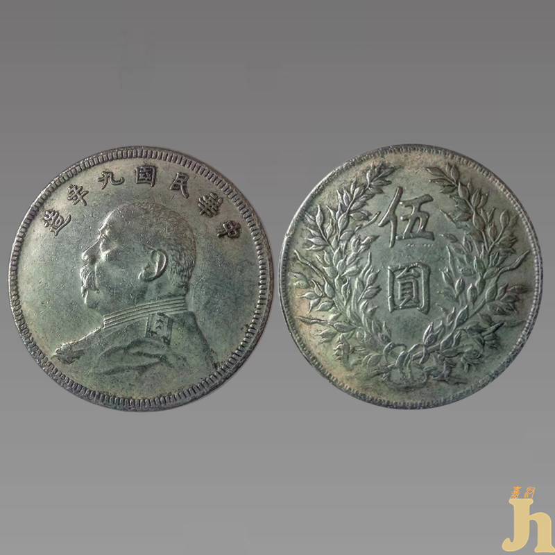 袁大头”在货币收藏界被称为银元之宝,它是中国近千种近代银币中流传最广、影响最大的银元品种,也是近代中国币制变革中的一个重要角色。此中华民国九年袁大头伍圆是历史的见证,属珍贵收藏品,极具投资价值和收藏价值,文化品位备受收藏者的青睐,上列“中华民国九年”六字,背面两条嘉禾,左右交互,下系结带,中铸‘伍圆’二字。伍圆袁大头在市面上,极其少见即使是“百年高龄”,但是仍然保存完整,品相较好。九年袁大头伍圆相对与壹圆的尺寸重量要大一些,而且数量也相对少很多,是非常珍稀的一枚银币。此枚九年袁大头伍圆钱币,品相完整,铸造精美,子口,纹路和边齿深峻,钱币表面包浆醇厚自然,字迹清晰,人物和麦穗形象栩栩如生,在钱币中实属精品,具有一定的收藏价值和文化艺术欣赏价值!