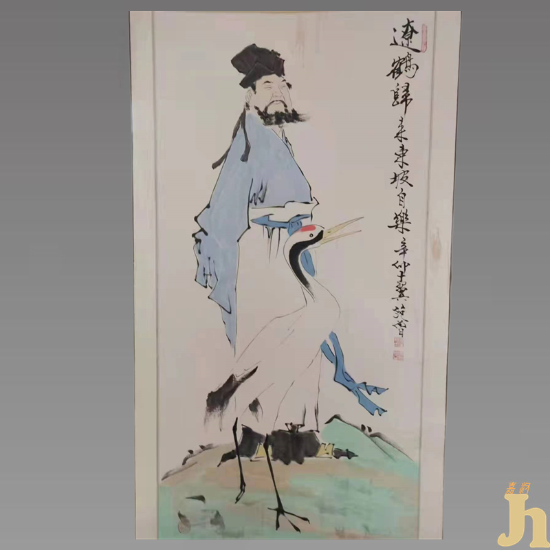 此幅为范曾遼鹤归来东坡自乐图。字画的面风格清新俊朗,构图形式新颖大方,表现手法娴熟质朴。人物表现依然是范大师的典型风格,以线为主,略加晕染,面部表情生动祥和。在线条运用上,范曾运用了国画钩线技法中“钉头鼠尾”的技法,线条苍劲有力,充满生命力。此画用笔极为简练,浓墨勾衣纹,轻巧明快;淡墨勾人物脸部,细腻生动。范曾的历史人物画清新典雅,潇洒飘逸,栩栩如生, 呼之欲出,风骨独具。具有一定的收藏价值和文化艺术欣赏价值!