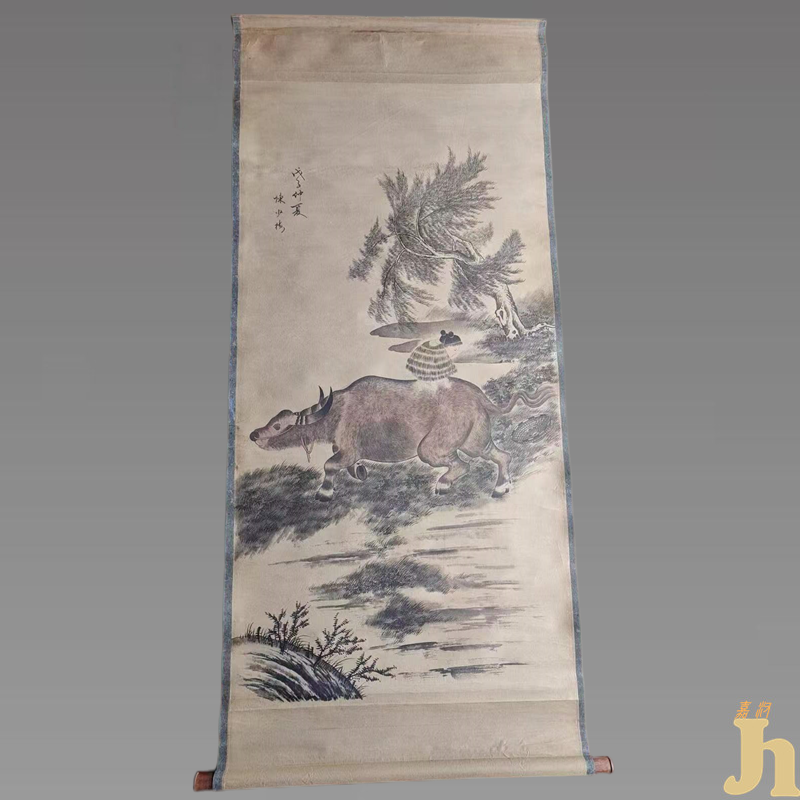 陈少梅笔墨潇洒而不失法度,洋溢着和谐的节奏与优雅的韵律,形成了自己清逸淡雅、寓柔秀于阳刚的清劲画风,于艺坛独树一帜。他则陶醉于轻松惬意的挥写,不管是水牛、柳树还是牧童,烟雨迷蒙,无不让人感到真实亲切,或是陷入童年的回忆,或是生出对故乡的眷恋,淳朴温馨的气氛,让人迷恋不已。这件牧牛图以稚拙憨厚的笔墨刻画了牧童和牛,两个反差强烈的形象组合在一起,在对比中能协调,画面富于浓郁的生活情趣。牛的不紧不慢的步伐,牧童漫不经心的情态,不由得使人联想起“牧童归去横牛背,短笛无腔信口吹”的诗境。具有一定的收藏价值和文化艺术欣赏价值!