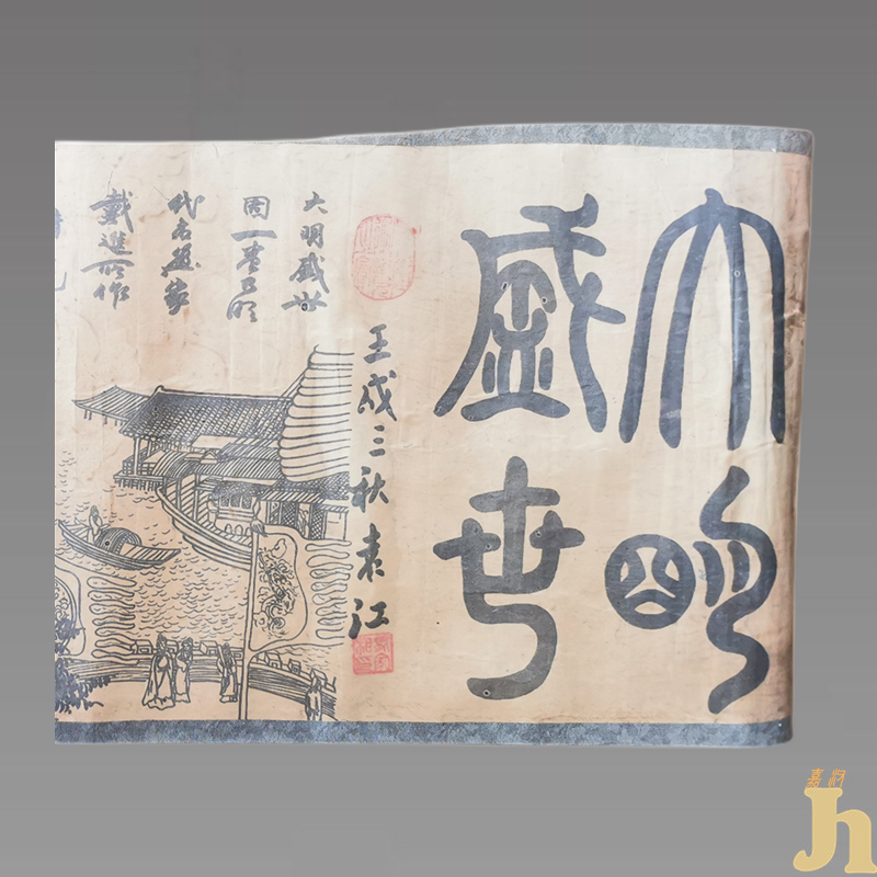 画题篆书大字,大明盛世,壬戌袁江。作品完成于明英宗正统七年,公元1442年。其时,戴进五十四岁。明宣宗一家人,御使南京秦淮河九年以后,太子朱祁镇已经登基明英宗皇帝七年。