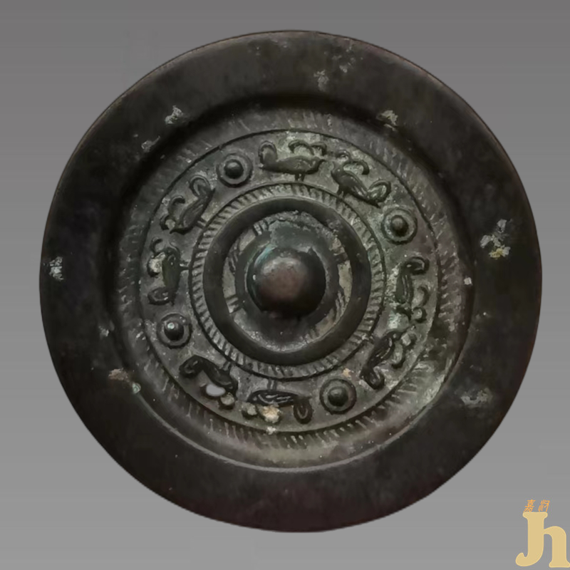 此铜镜为圆形。缘从突缘发展成平缘、斜缘,镜钮采用半球形钮、连峰钮、兽形钮等。镜面近平 , 制作精良,形态美观,图纹华丽,质地厚重,镜背花鸟纹乳丁纹凸起、雕刻工艺精湛,纹饰栩栩如生,寓意深刻。图案丰富多样,是中国古代青铜艺术文化遗产中的瑰宝。具有一定的收藏价值和文化艺术欣赏价值!