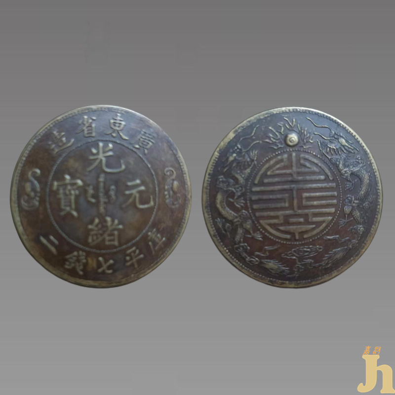 此枚钱币为库平七钱二的版式,正面珠圈内铸有满、汉文“光绪元宝”四字,珠圈外上镌“广东省造”四字,下镌“库平七钱二”五字,左右两侧分镌蝙蝠图案。背面珠圈内铸圆形“寿”字,珠圈外铸双龙戏珠图案。因蝙蝠的“蝠”字与幸福的“福”字同音,把蝙蝠图案铸在币面上,系取“蝠”、“福”两字谐音。将它与背面的“寿”字相对应取意,便构成“福寿双全”之意。具有一定的收藏价值和文化艺术欣赏价值!