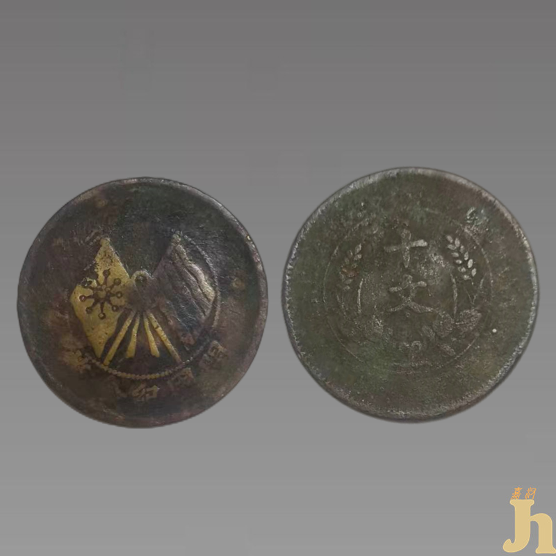 民国开国年间发行过几款开国纪念币,大家比较熟知的是孙中山开国纪念币金币与银币,除此之外,还有一款双旗铜币也被人们广泛流传使用,它就是开国纪念币十文铜币。