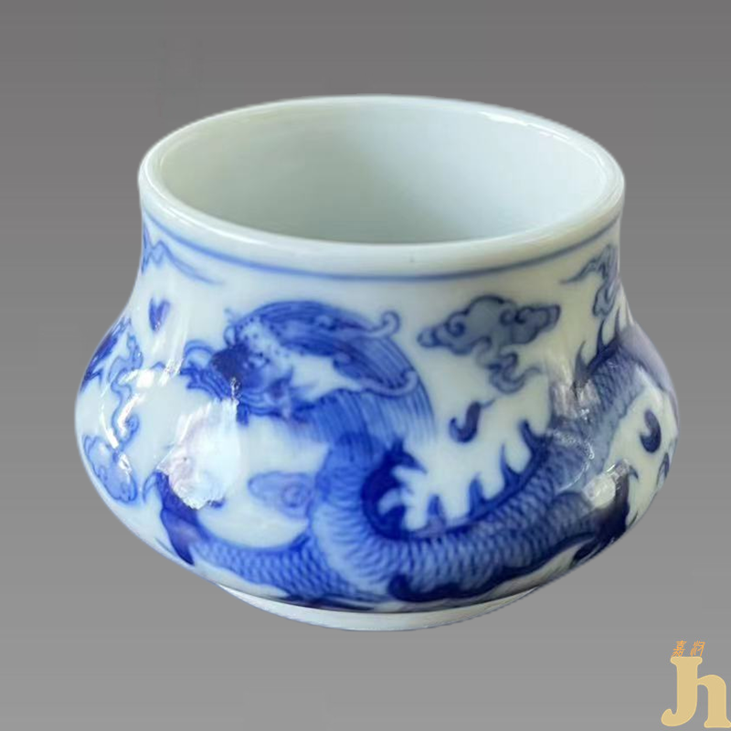 此“青花龙纹水盂”,青花属于釉下彩瓷,有白地蓝花和蓝地白花两种,色调明净,纹饰典雅清逸,且有水不褪色之特点。龙在中国传统文化中是权势、高贵、尊荣的象征,又是幸运与成功的标志。龙的各部位都有特定的寓意:突起的前额表示聪明智慧;鹿角表示社稷和长寿;牛耳寓意名列魁首;虎眼表现威严;魔爪表现勇猛;剑眉象征英武;狮鼻复象征宝贵;金鱼尾象征灵活;马齿象征勤劳和善良等。具有一定的收藏价值和文化艺术欣赏价值!