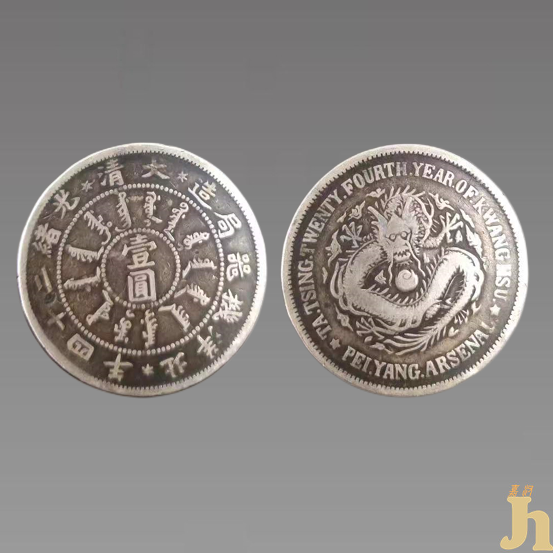 此大清光绪二十四年北洋机器局造壹圆银币正面的周边环镌汉文“大清·光绪二十四年·北洋机器局”,中环满文,从“清”字下满文旋读,汉文译为“大清国光绪二十四年北洋机器局造”,内环“壹元”二字;背面的周边镌英文,币中央镌一个蟠龙。辅币文字图案与主币相同。此钱币工艺精湛,雕工完美,浮雕感非常强烈,镜面平整光滑,纹饰的相惯线(相惯线——现代机械制图学术语,即平面与平面、平面与曲面及曲面与曲面之间的交线。)显得非常清晰,特别是北洋机器局系列银币铸造精美,字口、纹路和边齿深峻。具有一定的收藏价值和文化艺术欣赏价值!