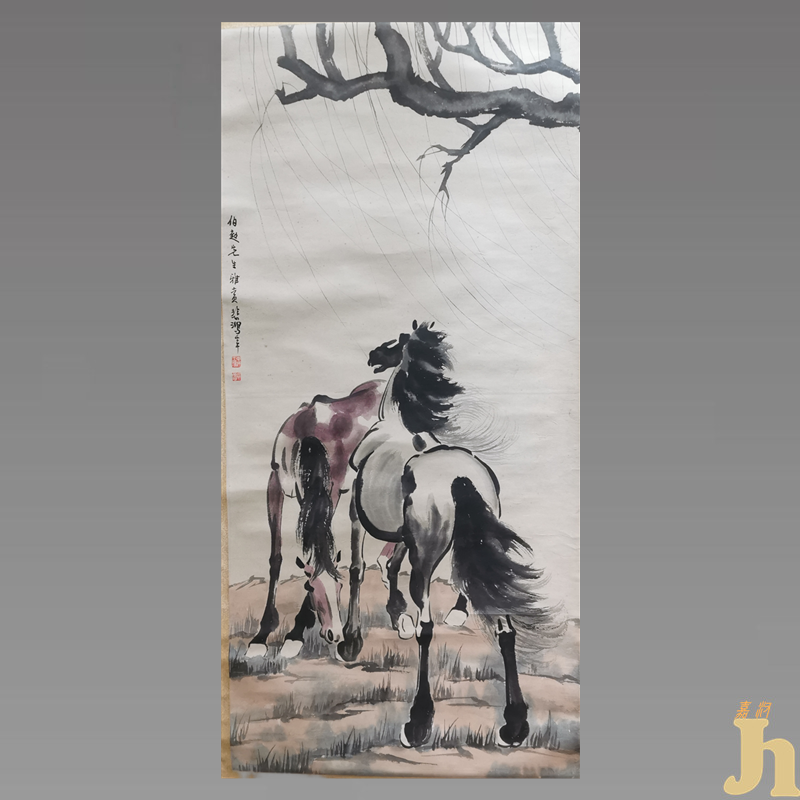 此双骏图画面一马俯首啃草,一马昂首眺望,综合了良马的优点。它的主要特征为骨骼突出、肌肉富有表情,鼻孔扩大,胸肌发达,传达出自由奔腾的美感。骏马的鼻孔硕大,体现肺活力充盈,这也是徐悲鸿画马的一大特点,悲鸿画马,在描绘四肢上尤其经意,膝、踝关节的塑造坚实、充分,哪怕是勾勒蹄子轮廓的一根线条,都要表达出体积、质感与空间。最后,还以迅疾之笔势,用浓墨和焦墨绘出鬃、尾的飞舞之状,并以白粉施于鼻梁骨之最高处,拉开黑白对比,以收画龙点睛之效。悲鸿笔下的马腿比一般画家所画的都要长,但观者会感到夸张得恰到好处,一看便知是驰骋征战,不受羁绊的骏马。它形神兼备,生机勃勃,是马的形象在国画传统中的现代升华。具有一定的收藏价值和文化艺术欣赏价值!