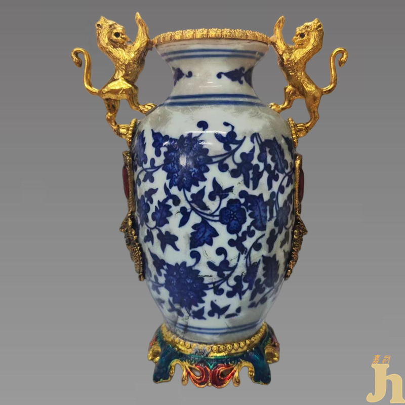 此青花缠枝花卉纹贴金瑞兽镶边赏瓶,图案纹饰构图奇巧,线条洒脱。器型精致,胎体细腻洁白,纹饰精美,绘青花缠枝花卉纹,线条流畅,青花发色漂亮,两边镶嵌瑞兽,人类对瑞兽的崇拜表现了中国古代劳动人民想平安幸福的朴素愿望;对瑞兽的图腾崇拜是原始人群体的亲属、祖先、保护神的一种追崇与敬畏。具有一定的收藏价值和文化艺术欣赏价值!