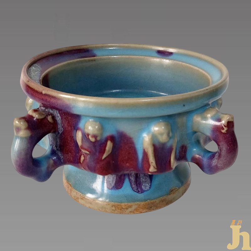 “纵有家财万贯,不如钧瓷一片” 此钧窑佛像浮雕簋式炉,胎质细腻老道,釉色华丽不失古朴,、茄紫色的窑变釉仿佛是注入了活动的血液,流动感让藏品古老的生命正在延续,釉质天青色乳光晶莹,肥厚玉润,类翠似玉赛玛瑙,有巧夺天工之美。釉流动很快,流动处呈现紫红,釉面常有桔皮纹似片状,反光显五色。在高古瓷时代,瓷器的装饰技法很少,常常仅见单色釉,而钧窑这种万彩斑斓的窑变效果让当时之人大开眼界,认为是天成之物,随大乘佛教之兴起,佛像之雕刻始盛行,亦炉身浮雕佛像,依稀可见头部四肢,栩栩如生,当时崇尚佛教,而钧窑的自然窑变效果很契合道家的自然无为之思想,当时之人自然就对钧窑比较看重。四耳分布均匀在盘身四周,方便提拿,高端大气,簋式炉作为高级别礼器之典型,为收藏之最!钧瓷之美胜于釉色,三分人力,七分天成,其间色彩的流淌与幻化,非巧思可以成就,尤以紫钧最为典雅,釉彩之绚丽宛若晚霞,而釉质之细润,犹似一泓静谧湖水。其烧造颇为周折,先需模制成型,再经多次素烧、施釉。因釉彩本身乳浊黏稠、流动缓慢,故上下加迭色泽不同的釉彩,极易形成斑斓、交织的现象,乃至一窑一火烧制的钧瓷,变化万端,无一相类,故有“钧瓷无双”之誉。规整大气。通体遍施天蓝釉,釉质温润湉静,富有乳浊之感。器型工整精美,窑变色变幻莫测,局部包浆和周身开片的沁色自然而雅丽,如此特质,与抽象画作异曲同工。本藏品茄紫斑超卓臻善,令人惊叹。此藏品实属难得,为宋代瓷器风格文化至今的延续,意义非凡,具有一定的收藏价值和文化艺术欣赏价值!