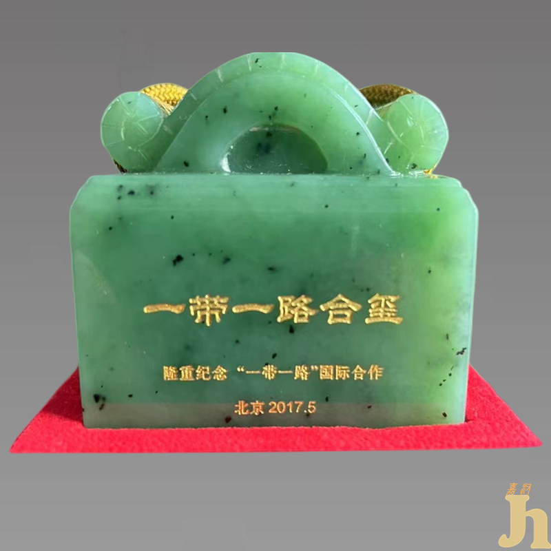 此一带一路合玺青玉往往比较块度较大、质地细腻、温润、油性好,呈现一种特殊的油亮光泽,就象表面渗出一层油来,即所谓"出浆"玺钮以竹简、如意、拱桥为创作蓝本,象征通过“一带一路”这一“友谊之桥”的连接将中国的经济、文化等传播到世界各地,秉承共商、共建、共享的原则,与各国加强友好沟通、互通有无,同时,祝愿世界各国人民生活吉祥、万事如意。玺钮上雕琢篆体文字为北宋司马光所著《资治通鉴》216卷对丝绸之路河西走廊段繁荣景象的描述:“是时中国盛强,自安远门西尽唐境凡万二千里,闾阎相望,桑麻翳野,天下称,富庶者无如陇右。”玺基正面为“一带一路合玺”“隆重纪念‘一带一路’国际合作”及“北京2017.5”字样;背面为中英双语“共商 共建 共享”和“和平合作 开放包容 互学互鉴 互利共赢”字样及工美玉器标识;左右侧面分别为“一带一路”沿线国家名称的中英文;印文为篆体“合”字。具有一定的收藏价值和文化艺术欣赏价值!