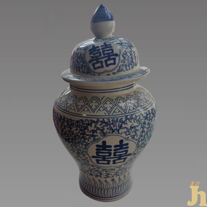 清代青花“囍”字盖罐,始于清朝中期。俗称为“喜字罐”,亦有“双喜”罐之说。其器型是由一坛,一盖相组而成。古人对双喜罐用途多作于婚嫁之时用来装糖果花生之属,后来亦有被大户人家用作于泡菜等功能。