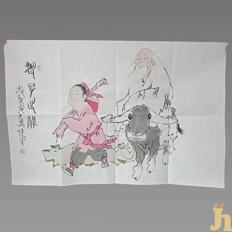 在《范曾散文三十三篇》的“紫气东来”一篇着,范先生有这样的画外话:“我喜欢画老子,画他的说法演教,画他的闭目神思,画他的骑牛出关,而旁边总有一个稚拙无邪的村童作他的书仆,背着他的几卷《道德经》和饮水的葫芦。老子则素衣布鞋,须眉皓如积雪,而头发披散,不着巾帻,有飘飘欲仙、不与世争的风神。他微微地欠着腰,半睁半闭着那双洞察天地古今的慧目,寂然凝虑,悄焉动容。在老子面前,我心灵上有一种无法言状的感动,我笔下那霜雪似的毛发,正昭示着皑皑千山般明净高远的学识,那止水般的宁静,也象征着老子澄潭千尺、清澈幽深的思维。”范曾人物画清新典雅,潇洒飘逸,栩栩如生, 呼之欲出,风骨独具。具有很高的收藏价值和文化艺术欣赏价值!