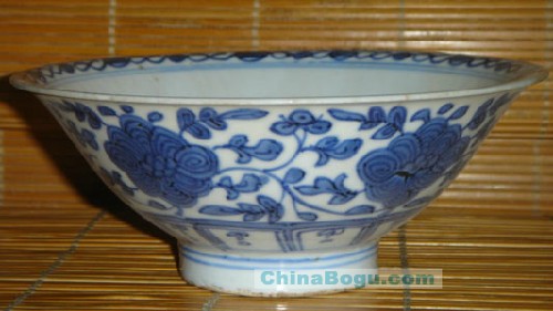 明末清初烧制的红绿彩绘花卉纹碗,在外销瓷中引人注目。清代青花瓷常见有“月记”款的缠枝莲纹大碗等。