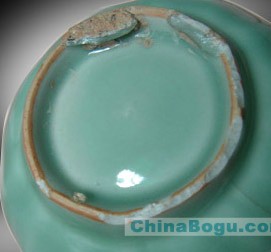 玉溪窑青瓷釉色与青花制品相同。装饰有印花、划花及无纹饰三种,印花多为阳纹花卉,划花为简单的云纹及水波纹等。